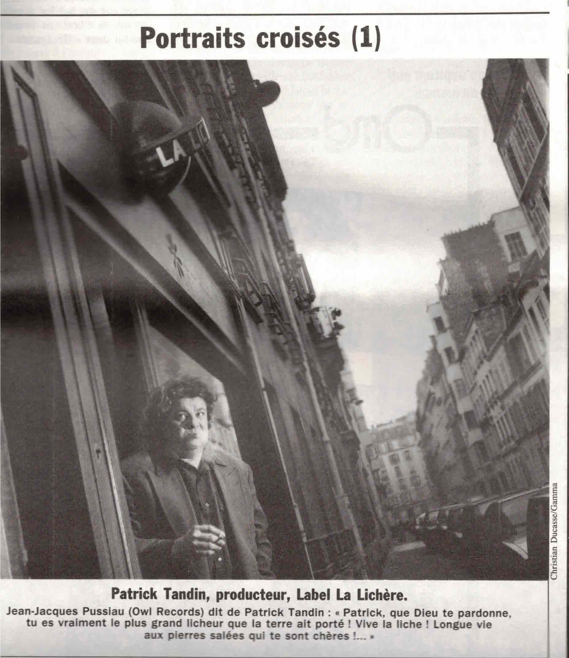 En octobre 1992, Alex Dutilh s’entourait de quelques complices pour créer, sur une idée de François Lacharme, un supplément gratuit au Monde de la Musique. Ce fut Jazzman, tabloïd « format Libé”, Une en couleurs, intérieur en noir et blanc. Parmi les photographes présents dès le premier numéro (Méphisto, Philippe Cibille, Véronique Guillien, Christian Rose, Jean-Marc Birraud et, pour la page “histoire”, Jean-Pierre Leloir), Christian Ducasse se vit confier une rubrique régulière et numérotée intitulée “Portraits croisés”. Ainsi chaque mois proposait-il une cliché posé d’un producteur phonographique commenté d’une petite phrase par le sujet du portrait prévu dans le numéro suivant. Les lecteurs du premier numéro purent ainsi découvrir Patrick Tandin, fondateur du jeune Label La Lichère, posant sur le pas de son bureau de la rue des Apennins, tel que photographié par Ducasse et commenté par Jean-Jacques Pussiau.