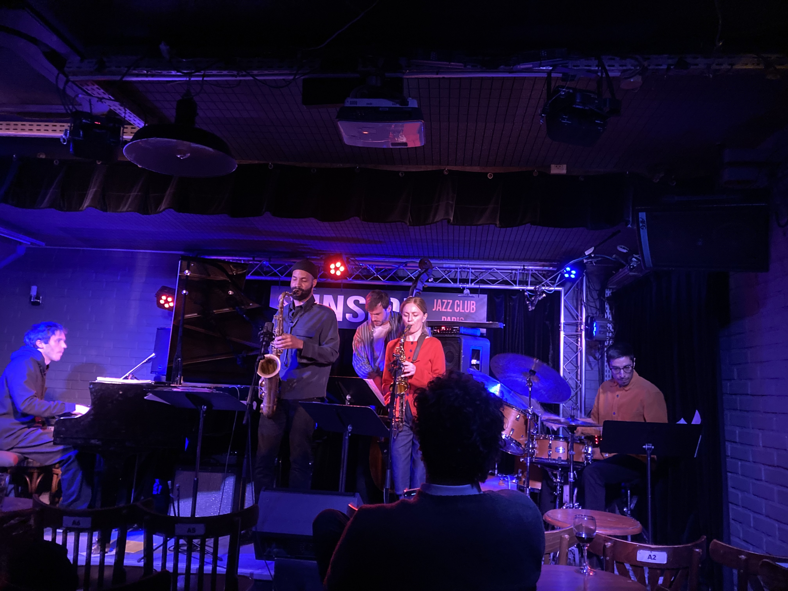 On admire notamment l’économie orchestrale dont il partage la front line avec sa comparse, Olga Amelchenko, répartit et combine les registres et les contributions du ténor et de l’alto, de l’unisson à l’homophonie, de l’homophonie aux contrepoints, du propos improvisé collectif à l’alternance de récits bien distincts, plein d’apropos et de nécessités aux contrastes saillants. On salue la façon dont le piano de Simon Chivallon est invité à tramer chaque composition, à s’en emparer jusqu’à en extraire, des interventions solistes d’une belle luminosité. On ne présente plus Étienne Renard et cette façon qu’il a d’assurer un groupe et un répertoire de sa puissance de jeu et de la malice de ses inventions. Je ne connaissais pas Jesus Vega. Reportant mon attention sur l’ardeur incisive de son jeu de baguettes sur la caisse claire et la faconde de sa double cymbale charleston, je pensais à Roy Haynes, ce qui n’est pas le moindre compliment, me désintéressant d’un usage plus quelconque des balais, ces balais qu’on oublie trop de savoir leur faire dire ce qu’ils pourraient avoir à nous raconter. J’étais néanmoins ravi d’avoir fait sa connaissance et regagnait ma banlieue ravi de ma soirée quoiqu’écourtée par les aléas de la vie et l’heure tardive de ce premier set de 21h30 que je quittais en enviant ceux qui restaient. Franck Bergerot